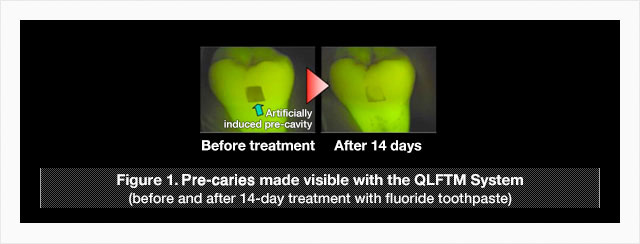 Lion was quick to see the potential of this approach and has been developing pre-caries diagnostic technologies since the 1990s. One such technology is the QLFTM System. Based on appearance alone, it can be hard to distinguish a pre-caries from a healthy tooth surface, and naked-eye inspections often fail to detect pre-cavities unless performed by the most experienced of dentists. As such, there is a need for an objective, quantitative diagnostic method. When a tooth is exposed to blue visible light it fluoresces. The tooth’s crystalline structure is rougher where a pre-caries is forming, causing the light to scatter and making the fluorescence appear darker compared with healthy areas. The QLFTM System takes advantage of this phenomenon to make pre-cavities more visible and precisely measure them. Figure 1 shows an artificially induced pre-caries before and after 14 days of treatment with a fluoride toothpaste. Making pre-cavities visible enables not just early detection, but also the easy and quantitative monitoring of their remineralization and return to health.