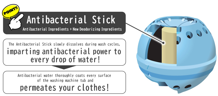 The Antibacterial Stick, incorporating antibacterial ingredients and a new deodorizing component, gradually dissolves during the wash cycle, imparting antibacterial properties to water used during the washing process, which then spreads across every surface of the tub and permeates the clothing being washed.