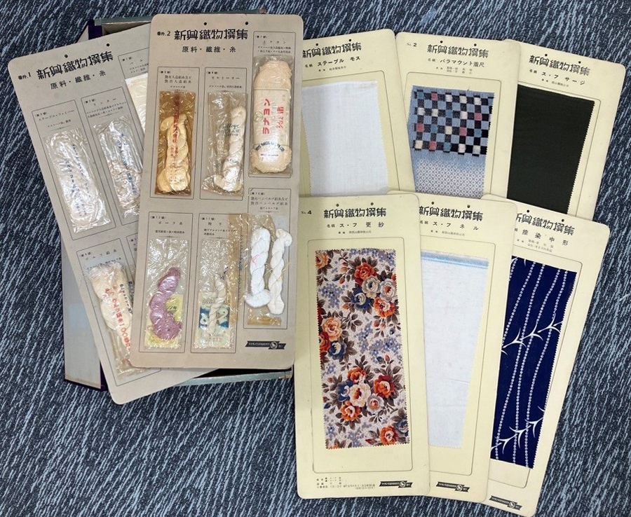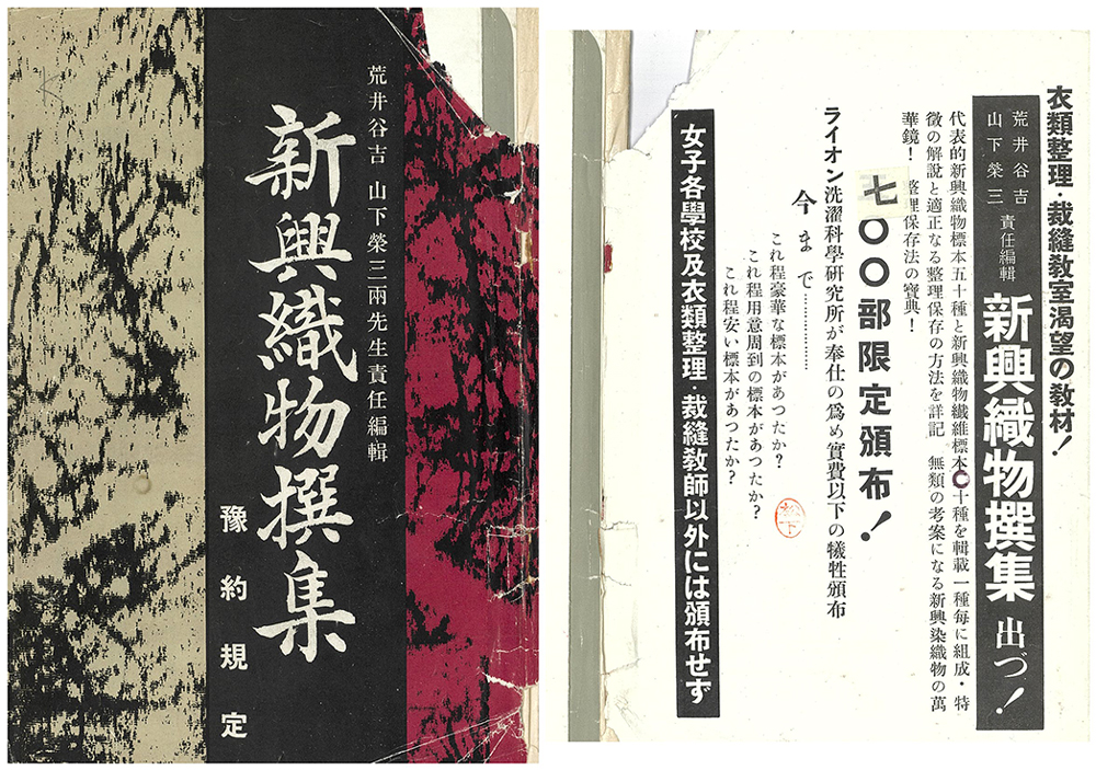 1938(昭和13年)に刊行された「新興織物撰集」は、生活者が当時多くの衣料に使用されていたステープル・ファイバーの取り扱いが難しいことを考慮して作られた教材です。洗濯科学研究所が株式会社三越(現:株式会社三越伊勢丹ホールディングス)の技師で、財団法人 大日本織物協会監事の荒井谷吉氏や、東京女子専門学校(現:東京家政大学)教授で日本衣類協会常務理事の山下栄三氏らに協力を仰ぎ、700部の限定ではありましたが、主に女学校の衣類整理教育に貢献するために教材として有料で配布されました。当時の日本で使用されていた主な50種類の繊維製品を取り上げ、それぞれのサンプルについての解説や保存方法、取り扱い、整理、洗濯方法が記されています。