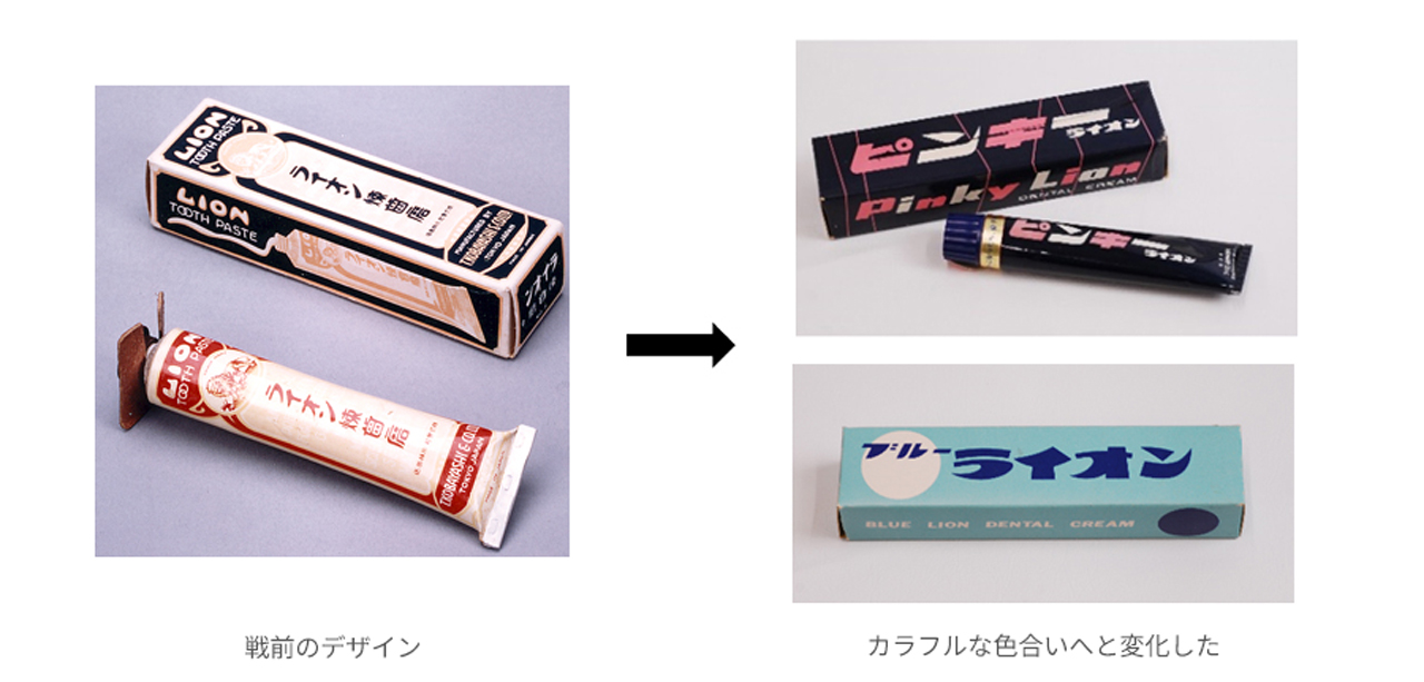 戦前のハミガキのパッケージは、堅い印象でしたが、戦後の1950年代は、アメリカの影響からかハミガキペーストの色はグリーン、ブルー、ピンクといったカラフルなものに変わっていきました。藤橋の担当したパッケージも、「ソフトライオン」「ピンキーライオン」「スーパーライオン」など、パステル調の色合いが特徴でこれまでとは全く違うパッケージデザインに変化していきました。
