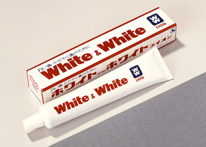 デザインについては、ネーミング決定までにいくつもの試作を経て、最終的に最もシンプルな「歯の白さ」強調した白地に赤文字に決まりました。二つのWhiteの文字を繰り返すことによりリズム感を出し、清潔感を表しています。包装箱にある上下のストライプは、白地の単調さを破るとともに競合品との差別化に一役買っていました。