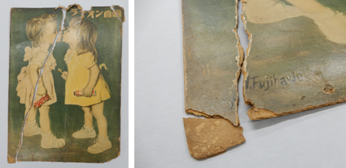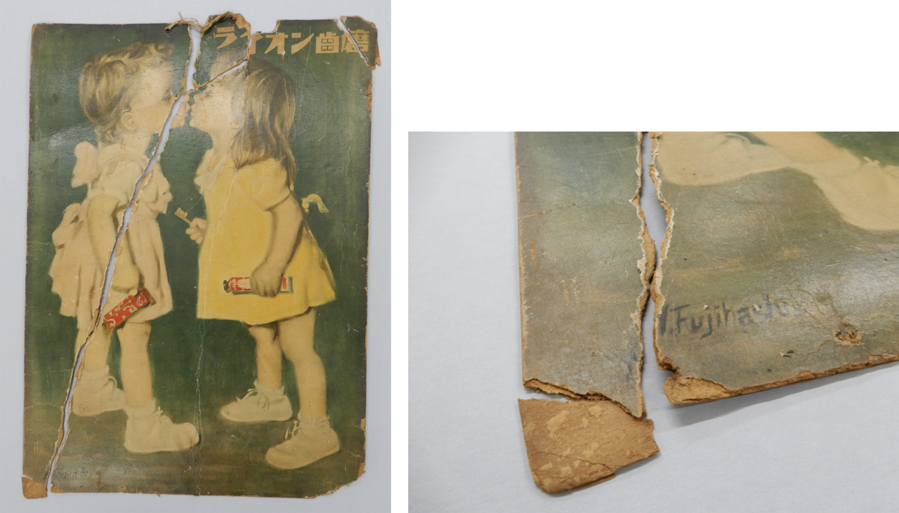 2人の少女が手にハミガキを持ち向かい合っている、こちらのかわいらしいポスター。保管史料を整理していた時に見つかったものですが、経年劣化で傷みがひどく、二つに裂けてしまっていました。とても良い作品であり、今後のアーカイブ展示等へ活用できると判断し、ポスター修復を株式会社資料保存器材に依頼しました。