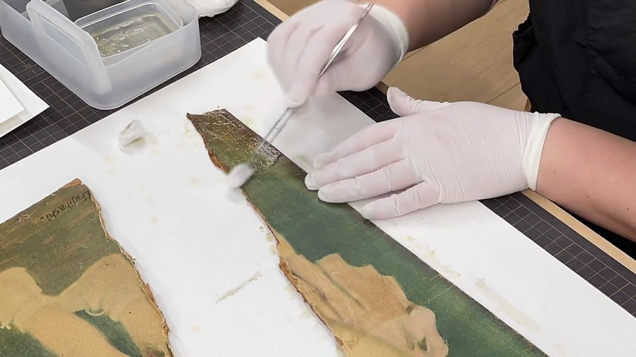 まず状態の確認をしたところ、油絵であると思われていましたが、圧縮ボードに貼られた印刷ポスターであることが判明しました。また、経年劣化のため破断してしまっている部分や、皺に沿って印刷インクが剥げていることも分かりました。