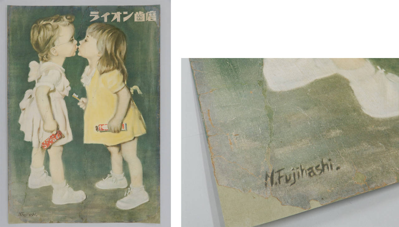 下の画像は、修復前と後のものです。印刷された当時の明るさを取り戻し、2人の少女の表情も、見違えるほど豊かになりました。また、左下に書かれたサインは劣化のため読み取ることが難しかったのですが、「M.Fujihashi」とはっきりと読み取ることができたことから藤橋正枝の作品であることが判明しました。