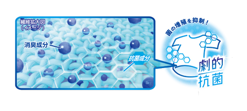 繊維のすみずみまで、極小消臭成分と抗菌成分が吸着。ソフラン最高レベルの抗菌力で、菌が増殖しやすい生乾き状態でも菌を生ませません※1。