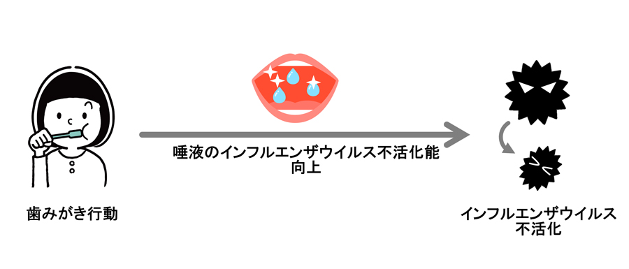 これまで、疫学調査により口腔衛生状態とインフルエンザの発症率との関連性が報告されていましたが※2、本研究では生化学的手法※3により、歯みがき行動によって唾液のインフルエンザウイルス不活化能が向上することを初めて明らかにしました。このことから、口腔内をきれいに保つことにより、ヒト本来の免疫力(唾液のインフルエンザウイルス不活化能)が向上し、外部から口腔に侵入するインフルエンザウイルスを不活化できる可能性が示されました。口腔内の健康維持のみならず、感染症への備えという観点からも、日々の丁寧な歯みがき行動が重要であると考えます。