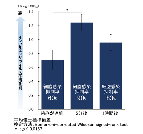 歯みがき行動前後の唾液のインフルエンザウイルス不活化能を解析した結果、歯みがき行動前と比較して、歯みがき行動5分後の唾液において、インフルエンザウイルス不活化能(細胞感染抑制率※6)が有意に向上することを確認しました。また、有意差は認められなかったものの、歯みがき行動1時間後においても高いインフルエンザウイルス不活化能が維持される傾向が見られました(図2)。
