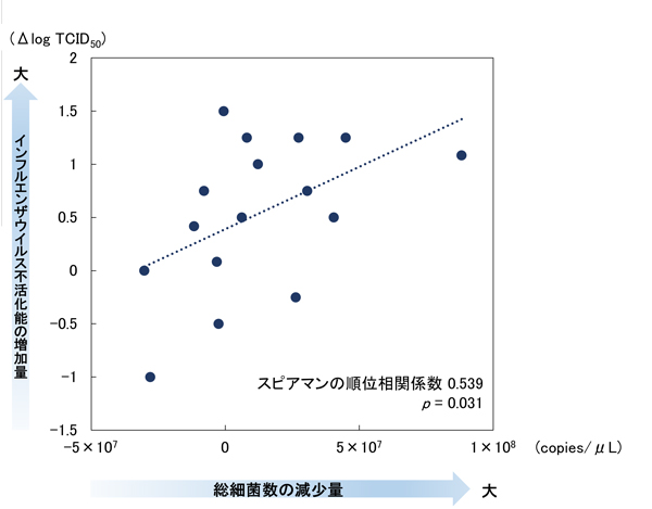 図3 歯みがき行動前後(5分後)での唾液中の総細菌数とインフルエンザウイルス不活化能の変化量との関係