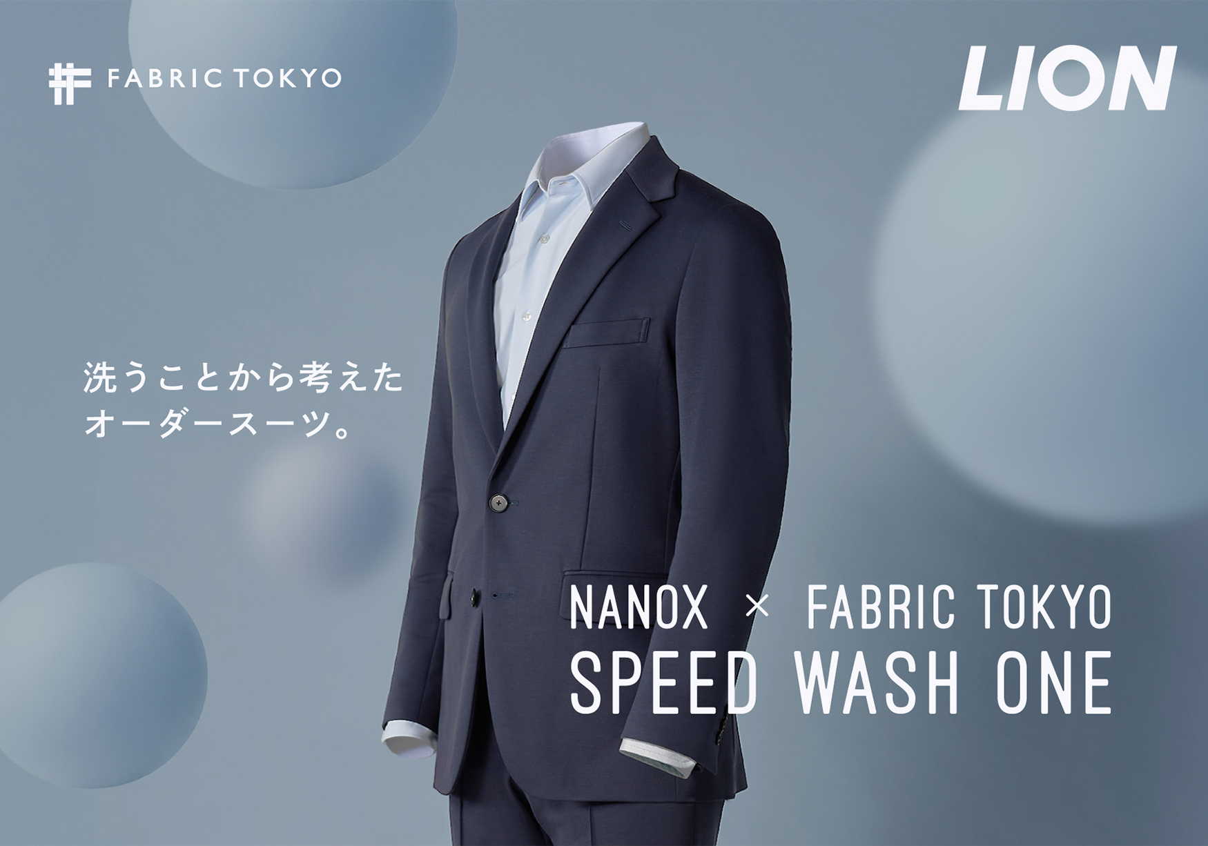 ライオン株式会社(代表取締役兼社長執行役員:竹森 征之、以下ライオン)は、カスタムオーダーのビジネスウェアブランド 株式会社FABRIC TOKYO (代表取締役:森 雄一郎、以下FABRIC TOKYO)との約2年にわたる共同開発を経て、オーダーセットアップ『NANOX × FABRIC TOKYO SPEED WASH ONE』を、2026年2月26日(木)にFABRIC TOKYOから発売いたします。本商品は、洗濯機の標準コースで洗うことができるウォッシャブルセットアップで、当社の衣料用洗剤『NANOX one PRO』を使用すれば、30回洗濯した後も新品級※1であることを検証しています。本開発は、当社が推進するサステナブル活動「Choose one Project」 にFABRIC TOKYOが参画いただいたことにより、実現しました。