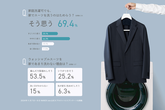当社が実施したウォッシャブルスーツのお洗濯実態に関する調査※2では、約7割の方が「ウォッシャブルスーツであっても家で洗濯するのをためらう」と感じており、「洗濯を失敗してしまうのでは」という不安や、そもそも「洗い方がよくわからない」といった課題を持っていることがわかりました。