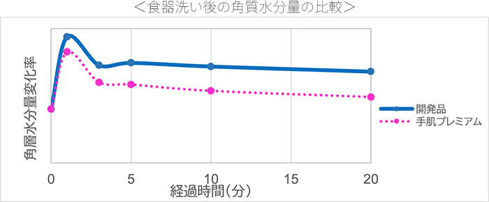 試験条件:各洗剤をスポンジで泡立てた泡を肌にのせてなじませた後、皮膚表面を流水で洗い流し、タオルドライ直後を初期として経時での角質水分量(%)を測定。