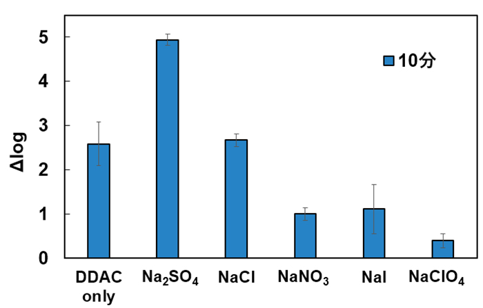 カチオン界面活性剤には、低濃度でもウイルス不活化効果を示し、殺菌剤や消毒剤として使用される塩化ジデシルジメチルアンモニウム (DDAC)を使用しました。Na+を含むさまざまな塩を添加し、各陰イオン種のウイルス不活化効果への影響を評価しました。