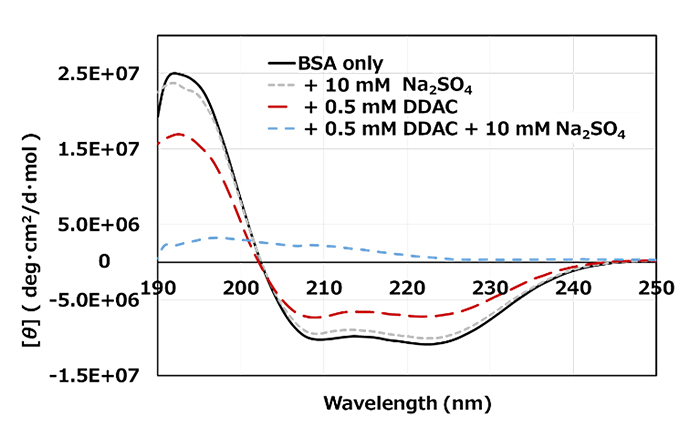 ノンエンベロープ型ウイルスは、前述の通り強固なカプシド(タンパク質の殻)を有しています。そこで、DDACとSO42-の共存が、FCVのカプシドのタンパク質をどのように変性させて、不活化効果を発揮するかの可能性を検証することにしました。実験に使用するタンパク質としては、界面活性剤によるタンパク質変性の研究で一般的に使用されるウシ血清アルブミン(BSA)を用い、タンパク質の構造解析に用いられる円二色性(Circular Dichroism: CD)スペクトルを測定しました。CDスペクトルは、光の性質を使ってタンパク質がどのような形状(らせん状、シート状などの立体構造の形)であるかが分かる評価方法です。DDACとSO42-が共存することで、タンパク質の立体構造がどのように変化するかを評価しました。