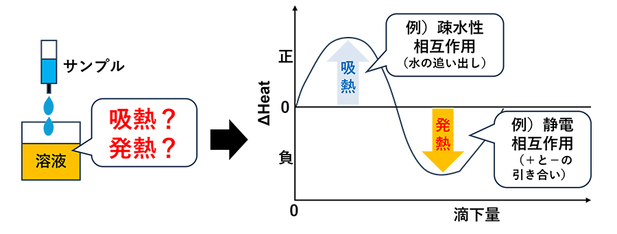 さらなるメカニズム解明のため、等温滴定型熱量計(Isothermal Titration Calorimetry:ITC)を用いて、Na2SO4の有無によるDDACとBSAの結合の様子の違いを検討しました。ITCは、分子同士が結合・乖離する際に生じる「熱の出入り」を測る装置です。グラフがプラスの値を示す場合は、疎水性相互作用を代表とする吸熱反応が、マイナスの値を示す場合は、静電相互作用を代表とする発熱反応が起きていることを示します。この熱の変化パターンから、分子間に働く力の種類や、結合の状態を解析しました(Fig.3)。