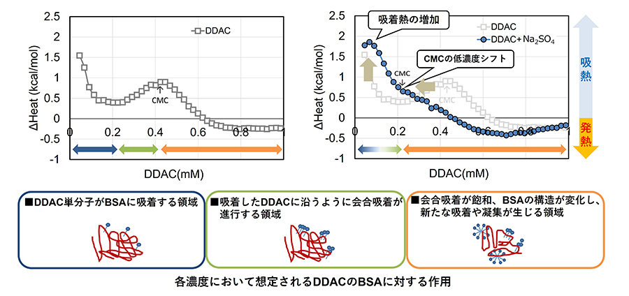次に、BSAにNa2SO4を加えた溶液に対してDDACを滴下したところ(Fig.4図の右側)、低濃度域の吸熱ピークの立ち上がりが大きくなり、CMCおよび発熱に転じる濃度が低濃度側へシフトしました(Fig.4の図の右側の青色○印)。これは、「BSAへのDDAC単分子ずつの吸着」と「DDACの会合吸着」がほぼ同時に進行したことによると考えられ、低濃度の時点からBSA の構造変化がNa2SO4の共存で促進されたと推察されます。図には示していませんが、BSA にNa2SO4のみを滴下した際には熱量変化が検出されませんでした。このことから、SO42-がBSAと直接的に結合するのではなく、Na2SO4は、BSAの周囲の水分子を奪う「塩析効果」によってBSAの構造変化を促進したものと考えられます。