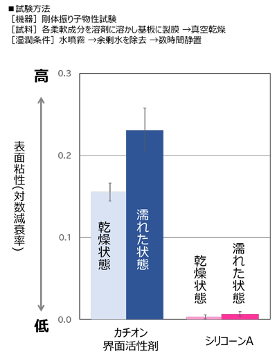 衣類の風合いを感じる場面として、衣類表面に直接肌が触れた時、特に衣類表面に手を滑らせた時であると仮定し、「シリコーンA配合柔軟剤で処理をしたときの衣類※3の表面」と「薄膜化したシリコーンA」の表面粘性を測定しました。衣類表面の物性を評価する手法の1つとして、剛体振り子試験機を用いた表面粘性の測定があります。通常、剛体振り子の振れ幅は、振り子が接する衣類の表面粘性が高い場合は、抵抗がかかるため減衰が早く、表面粘性が低い場合は減衰が遅くなり、抵抗を感じにくいと推察できます(図1)。今回、この剛体振り子試験機の振れ幅の減衰率(以下、対数減衰率)から、表面粘性を評価しました。その結果、シリコーンA配合柔軟剤で処理した衣類は、従来の柔軟成分であるカチオン界面活性剤で処理した衣類と比較し、表面粘性が低いことを見出しました(図2)。さらに、各成分膜の表面粘性を測定したところ、シリコーンAでは本来の表面粘性の低さを維持するのに対し、カチオン界面活性剤では水分によってゲル状に変化し、粘性が増大することを確認しました(図3)。このことから、シリコーンAの成分自体は衣類表面の水分とは混ざり合わず、衣類表面の粘性が増大することを抑制し、汗をかいたときのような濡れた状態のべたつき感を緩和することによって「さらりとした」風合いを実現していると推定しました。
