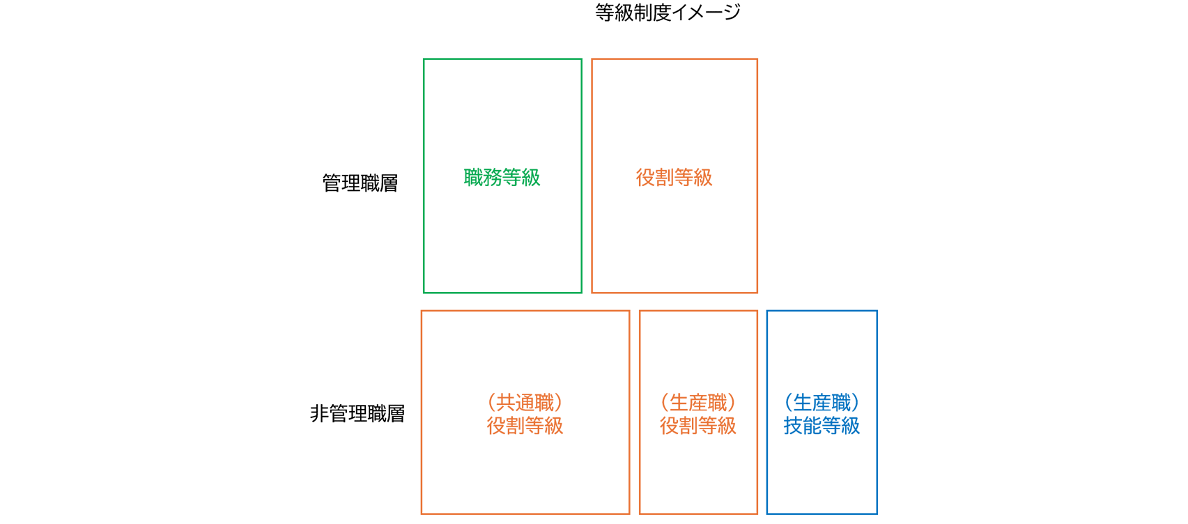 非管理職は役割型等級(生産職では役割等級と技術等級)となっており、自身の成長による役割拡大で段階的に昇任出来る仕組みとなっています。