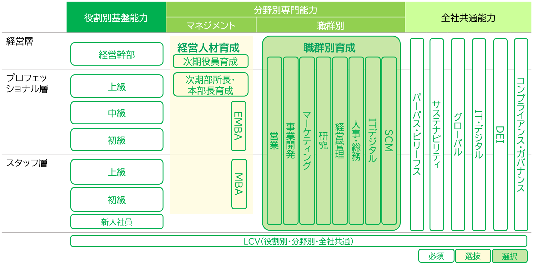 組織の中での役割に応じた成果創出力を高める「役割別基盤能力」と、個々人の専門分野ごとの知識・スキルを強化する「分野別専門能力」、ライオン社員全員に求める「全社共通能力」の3つの柱で能力開発を行っていきます。