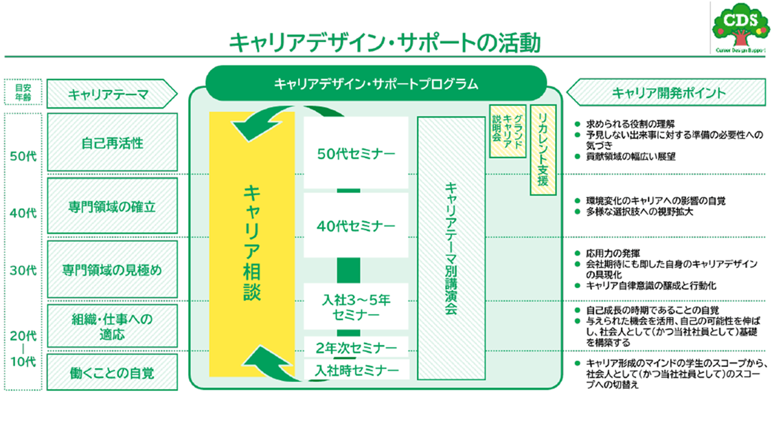 また、年代別キャリアセミナーやキャリアテーマ別講演会を開催することで、一人ひとりに寄り添い、それぞれの強みや経験をキャリアに活かす意識を醸成する機会を設けています。