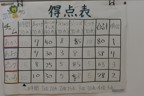スピードにおいてはトップを黄色チームにゆずりましたが、角ハンガーの干し方で高得点を獲得してカバーし、他の項目でも安定していた赤チームは本当に素晴らしかったです。