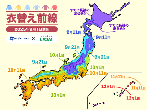 ライオンが秋の衣替えに向けて、長袖を着用し始めたり、衣替えの意識が高まってくるタイミングについて、お天気情報サービスを運営する株式会社ウェザーニューズとともに調査した結果、最低気温が「20℃」を切ると約5割、「18℃」で約6割の人が半袖から長袖に移行することがわかりました。そこで、最低気温が18℃になる予測日を可視化したものがこの「2025年衣替え前線」です。