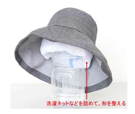 「洗濯ネット」を帽子に詰めて形を整え、ペットボトルなどにのせて干すと型崩れも防げてオススメです。