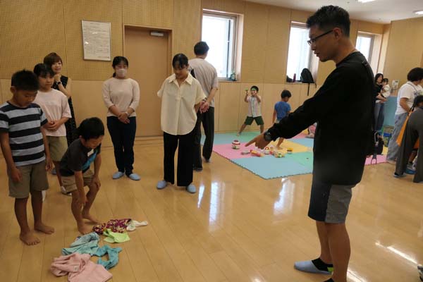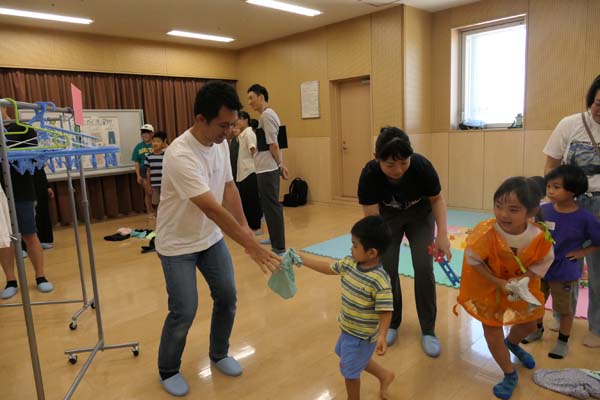 まずチームの中から「洗濯ものを干す担当」のパパを1人選出。子どもたちは、たくさんある洗濯物の中から干すものを1つ選んで、交代で干す人のところまで持っていきます。すべての洗濯物が干し終わったらゲーム終了。