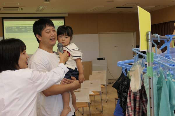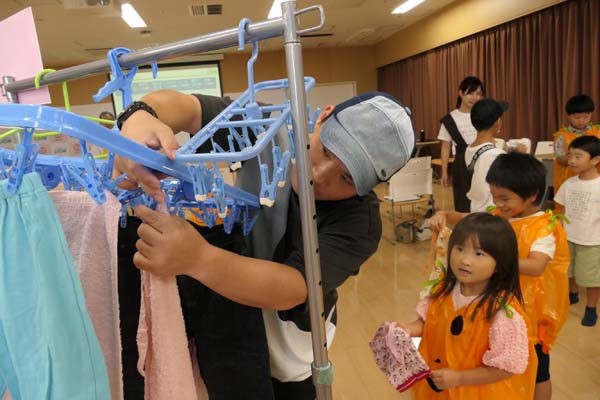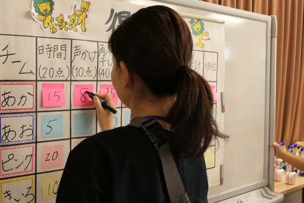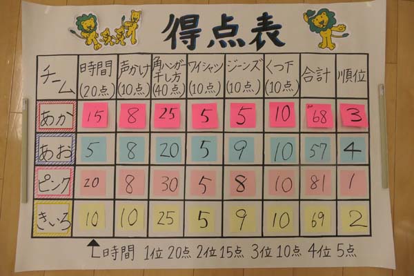 干し終わるまでの早さと角ハンガーの干し方で高得点をあげたピンクチームが圧勝!一方で、早さでは3位に甘んじた黄色チームは、洗濯物を持ってきた子どもたちに欠かさず「ありがとう」と伝えていたので声かけで満点を獲得し2位に滑り込む結果となりました。