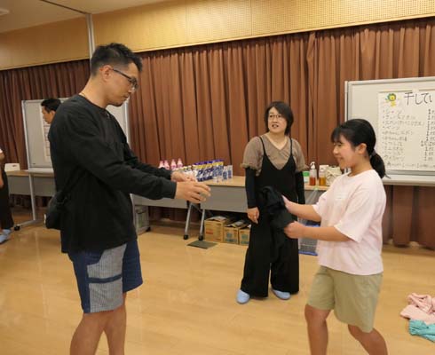 セミナーのラストは、毎回驚くほどの盛り上がりを見せる、明石では恒例のお洗濯レース。改めて、ルールを説明すると、4つのチームに分かれた参加者が力を合わせて、用意された洗濯物を干していきます。