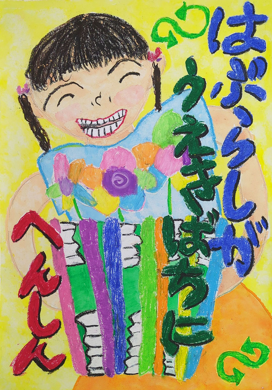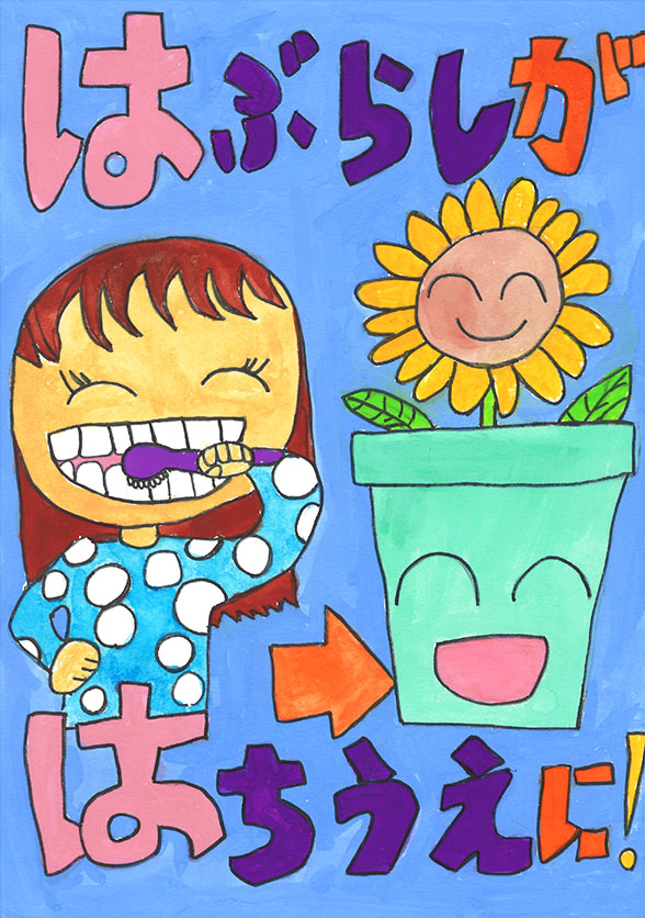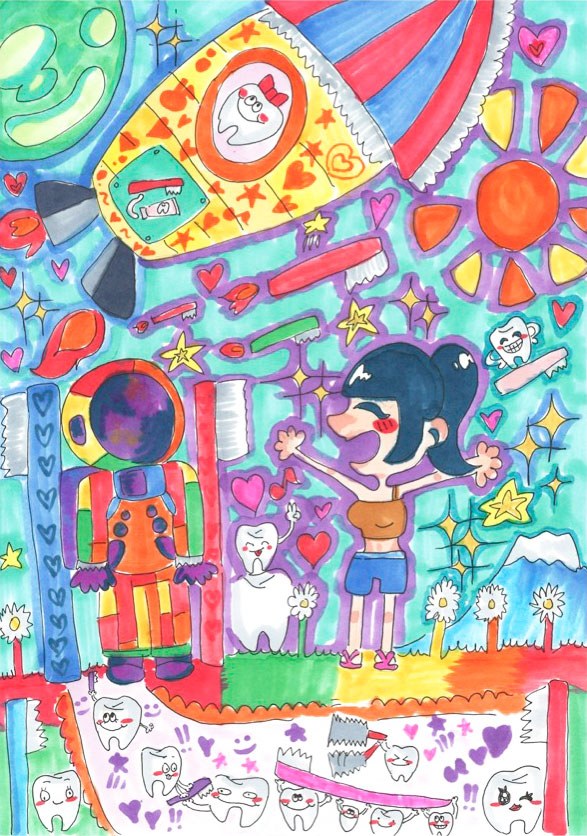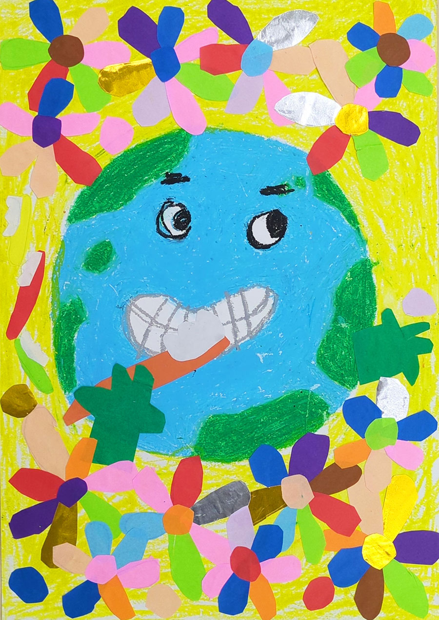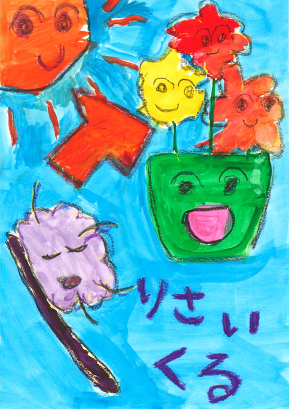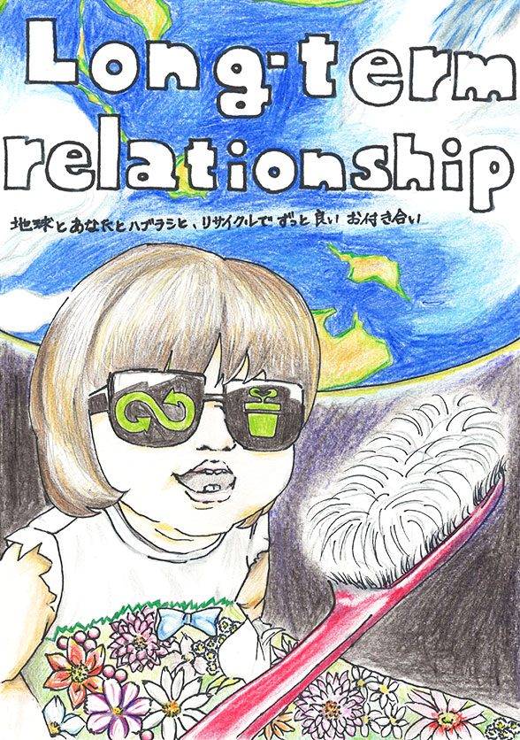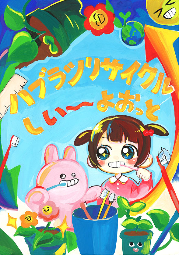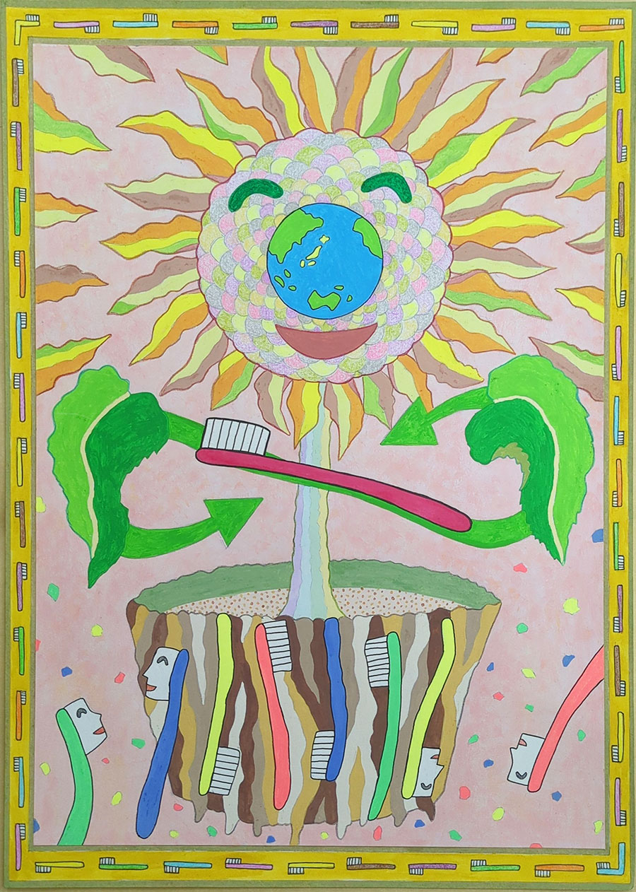 毎日使っているハブラシをリサイクルすれば、自然環境に優しい未来になると思います。このすばらしい活動が多くの人に伝わり、大きな花が咲くように地球が笑顔になるイメージを絵に描きました。