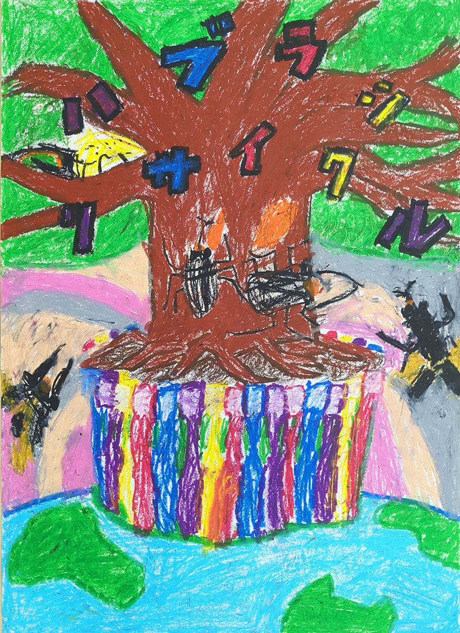 ハブラシが植木鉢になることに、とても驚きました。リサイクルすることでゴミが少しでも減って、世界中のゴミの中で暮らす子が、お花いっぱいの世界で暮らせますように。との思いで、お花をプレゼントしている様子を描きました。