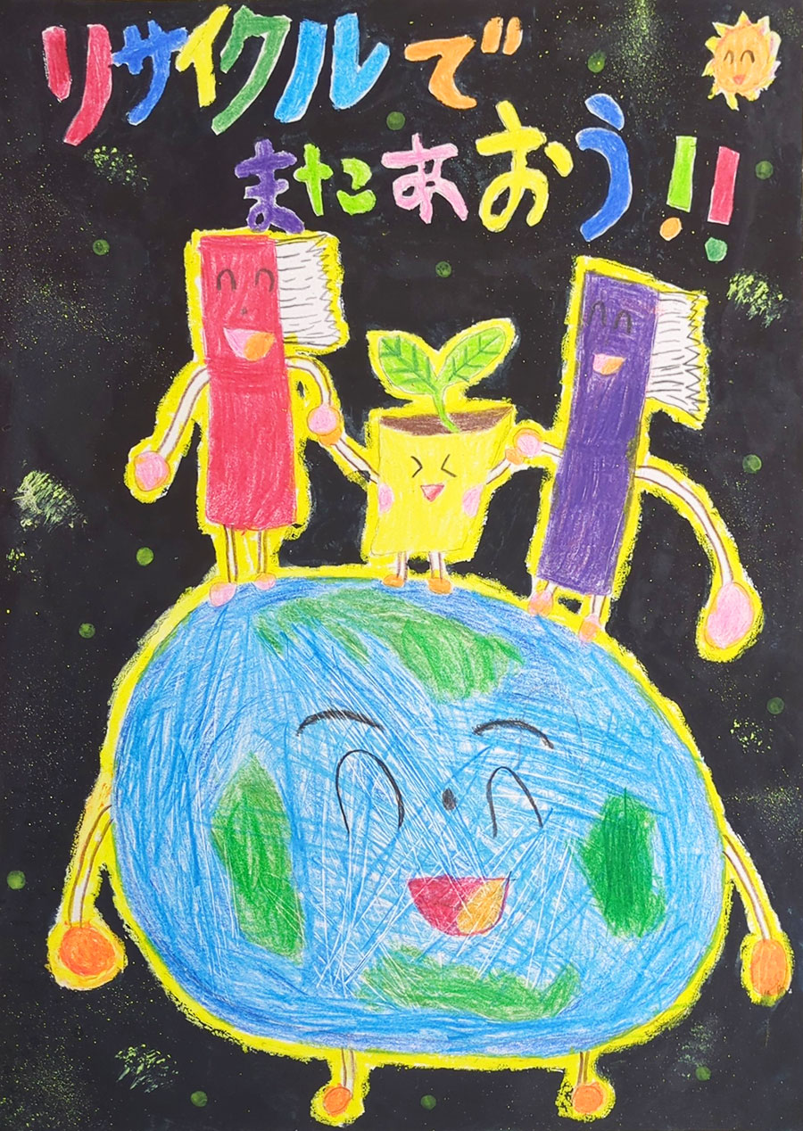 「みんなでピカピカリサイクル!」リサイクルをすると、地球がうれしくてピカピカになると思いました。みんなで仲よくリサイクルをして、地球をきれいにしたいです。ピカピカの地球でいっぱい遊びたいです。