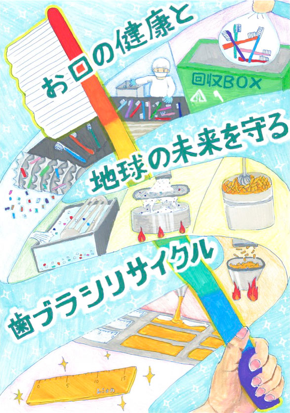 ハブラシリサイクルをたくさんの人に知ってもらうためにリサイクルの流れが一目でわかるといいかなと思ってこの絵を描きました。描くために私自身もリサイクルについて調べて勉強になったのでそれが伝わると嬉しいです。