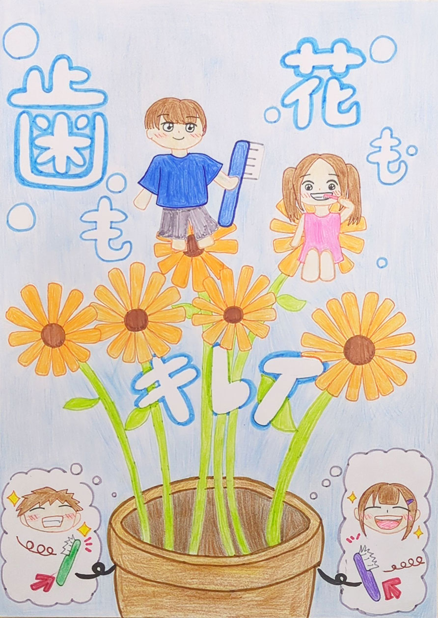 ハブラシリサイクルのおかげで、環境にもいいし、同じハブラシをずっと使うのではなく、1ヵ月で変えるという習慣がついて、花もキレイ、歯もキレイでちょー最高だと思ったので、このことを少しでも多くの人に伝わってほしいという思いがこめられています。また、この絵の世界観は、みんなの歯をきれいにして役目をおえたハブラシが植木鉢にうまれ変わって、ようせいたちのすみかになって、2つの役目を果たすという世界観です。