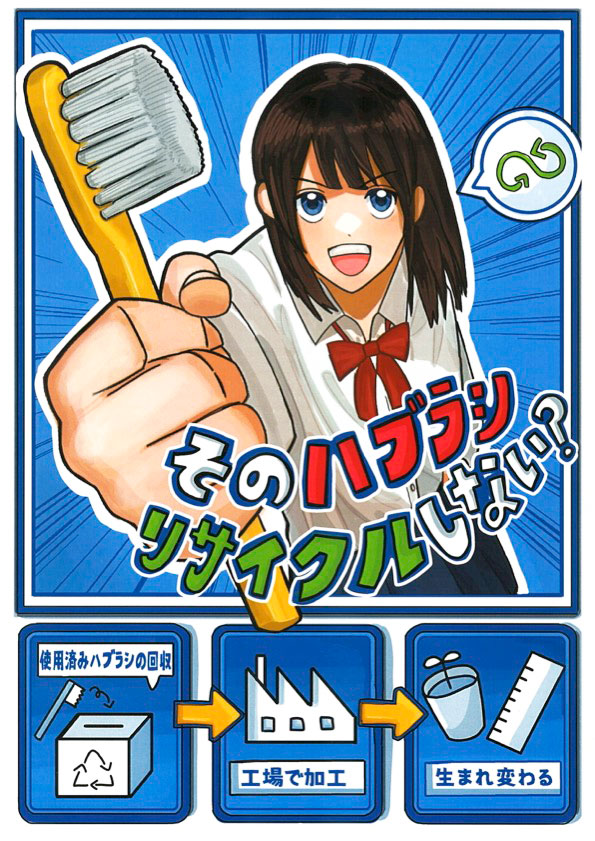 このポスターには、誰でも気軽に始めることのできるハブラシリサイクルについて、多くの人に知って欲しいという思いを込めました。ハブラシを女の子が突き出していて、見る人の目を引くように話しかけるようにしました。ハブラシリサイクルを身近に感じてもらえるよう語りかけるキャッチコピーにしました。見ている人が思わず立ち止まり、ハブラシリサイクルをしてみようと思ってくれたら嬉しいです。