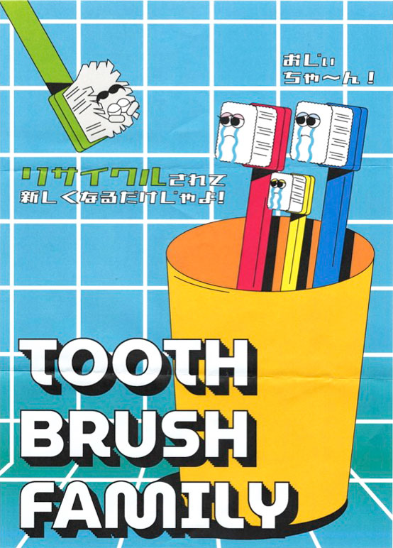 ハブラシを家族に例えて、古くなってしまったおじいちゃんとお別れの時がきてしまいました。でもおじいちゃんは笑顔で家族みんなに「リサイクルされて新しくなるだけだから、大丈夫だよ!」と伝えている絵をアメリカンポップに作成しました。